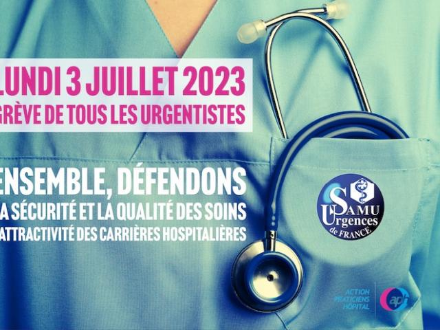 Conformément au préavis de grève déposé par Action Praticiens Hôpital le 8 juin appelant à cesser toute activité non urgente le lundi 3 juillet, Samu-Urgences de France a également déposé un préavis auprès du Ministre de la Santé et de la Prévention. .../... Le 3 juillet, notre ambition durant cette journée de grève est de montrer à quoi ressembleront nos services d’urgences, si rien n’est fait pour redonner une attractivité à nos métiers.