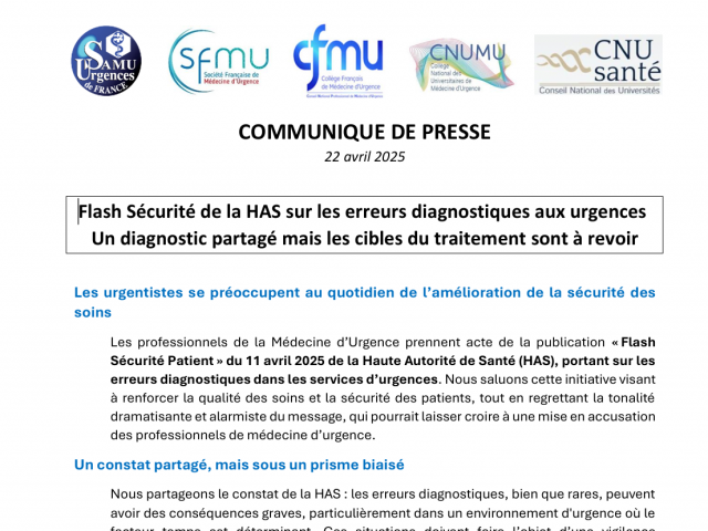 Les professionnels de la médecine d'urgence, dont SAMU-Urgences de France, prennent acte du Flash Sécurité Patient publié par la HAS le 11 avril 2025. Nous saluons cette initiative pour améliorer la sécurité des soins. Mais nous refusons que l’on pointe du doigt les urgences sans prendre en compte les causes systémiques...