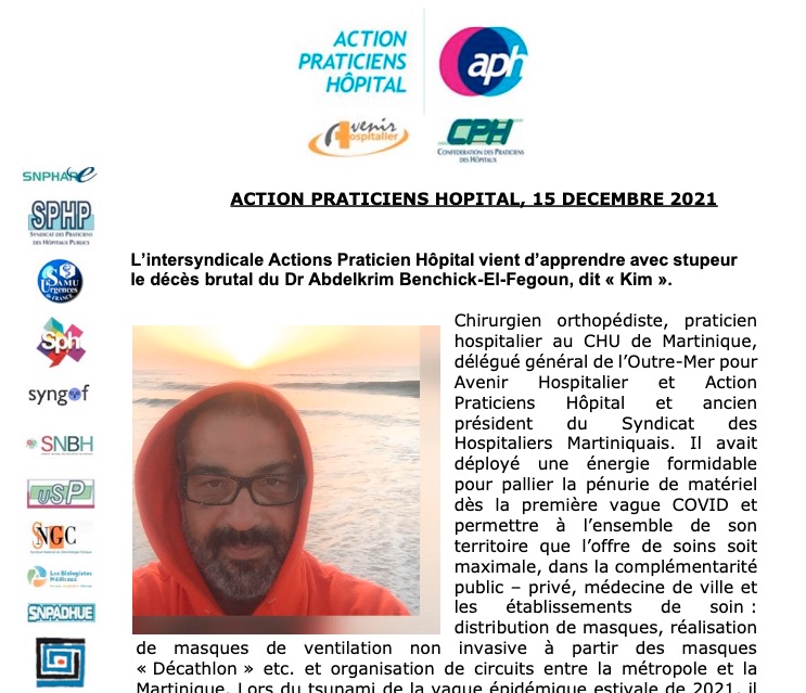 SUdF a appris avec consternation et une grande tristesse le décès brutal de notre confrère le Dr Adbelkrim Benchick-El-Fegoun, Praticien Hospitalier, chirurgien orthopédiste, syndicaliste engagé et reconnu. Nous nous associons à la tristesse de ses collègues et de sa famille.