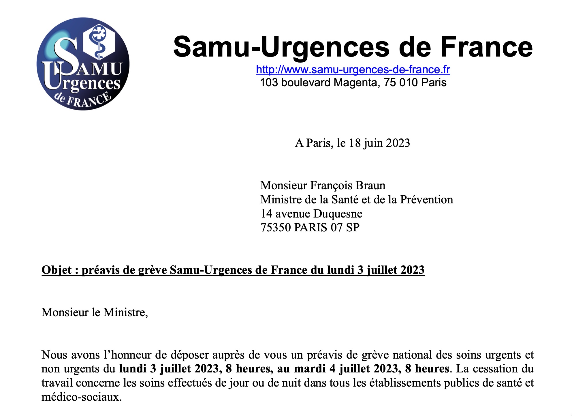 Préavis de grève Samu-Urgences de France du lundi 3 juillet 2023